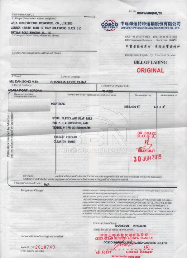 7. Bill of Lading for ASTM A36 Steel Plates